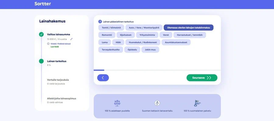 Pidämme lukuisiin testeihimme perustuen Sortteria parhaana palveluna tehdä yksittäisen lainan jälleenrahoitus.